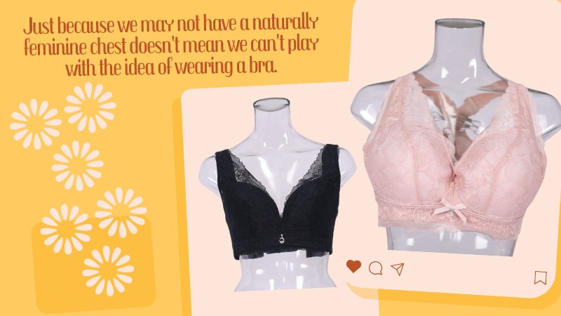 Just because we may not have a naturally feminine chest doesn’t mean we can’t play with the idea of wearing a bra. Bras come in all shapes, sizes, materials, and colors, and it’s the perfect way to explore what may work for you. There are even bras designed specifically for men and made with our unique bodies in mind!