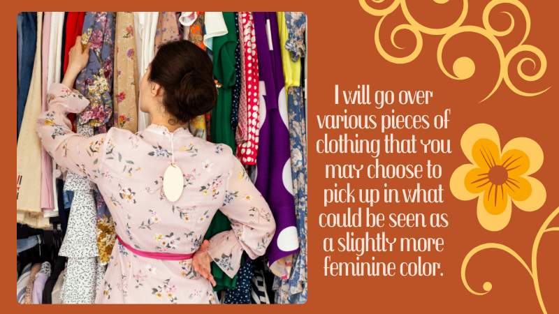 Now, we get to the really fun stuff! And this all depends on how confident you are with your femininity. Of course, your confidence will grow with time, but some of us would rather take a slow dip than plunge into the pool. I will go over various pieces of clothing that you may choose to pick up in what could be seen as a slightly more feminine color.