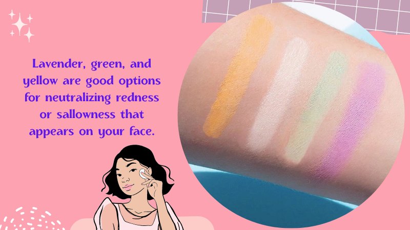 In this case, lavender, green, and yellow are good options for neutralizing redness or sallowness that appears on your face.