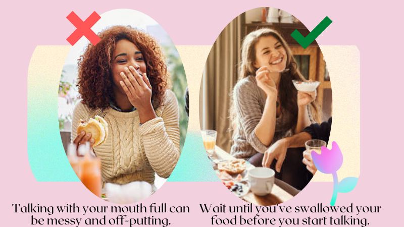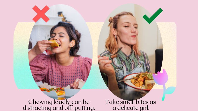 This is a common courtesy that’s often overlooked. Chewing loudly can be distracting and off-putting for the person you’re talking to. In most cases, annoying. Instead, try to chew with your mouth closed or take small bites as a delicate girl, so you’re not making too much noise.