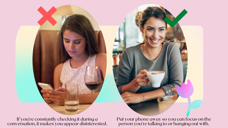 This can make you appear disinterested or unengaged in the conversation. It’s a good idea to put your phone away so you can focus on the person you’re talking to or hanging out with.