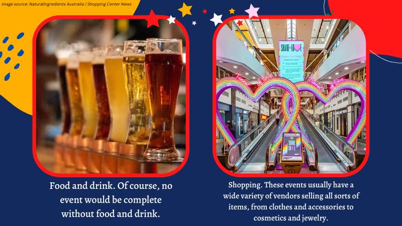 - Shopping. These events usually have a wide variety of vendors selling all sorts of items, from clothes and accessories to cosmetics and jewelry. This is an excellent way to pick up new things for my wardrobe or treat myself to something special.