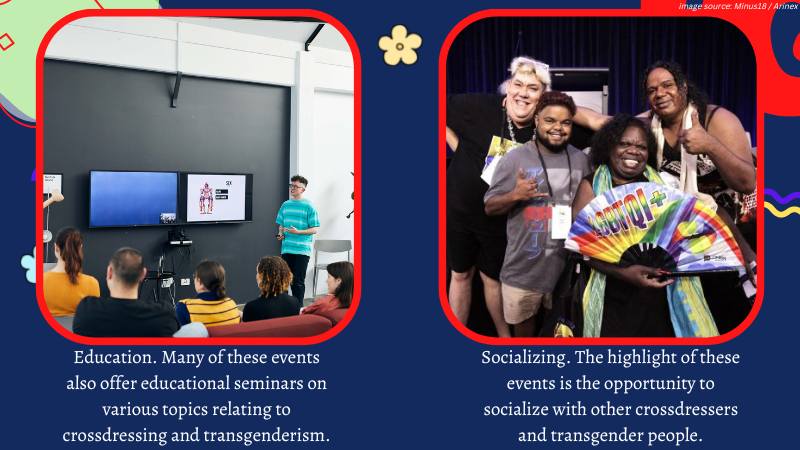 - Education. Many of these events also offer educational seminars on various topics relating to crossdressing and transgenderism. This is always an excellent way for me to learn more about these topics and get advice from those who have been there before.
