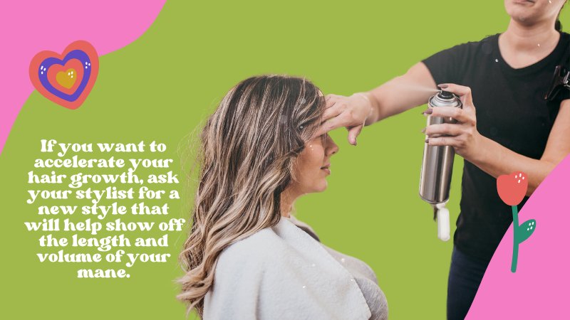 Sometimes, our hair is already growing; we just don’t realize it! If you want to accelerate your hair growth, ask your stylist for a new style that will help show off the length and volume of your mane. You can also use extensions or wigs to add instant thickness.
