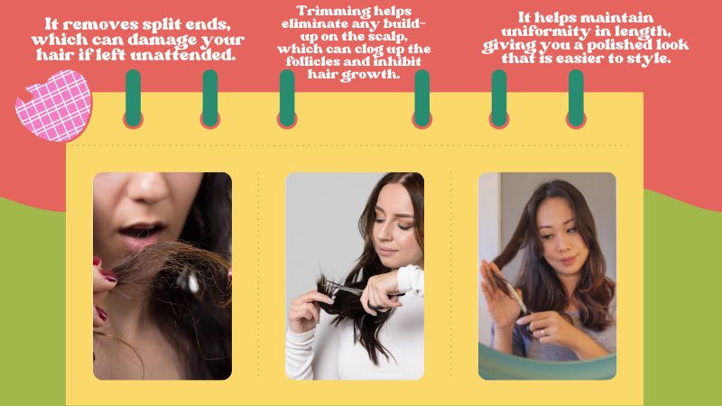 - Trimming helps eliminate any build-up on the scalp, which can clog up the follicles and inhibit hair growth.