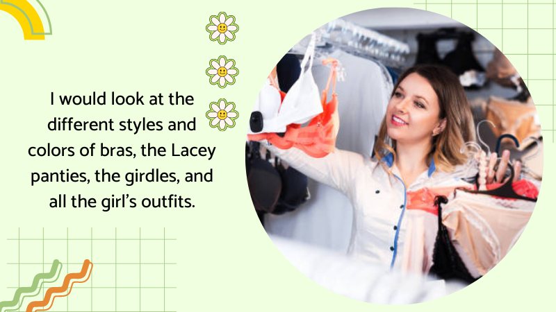 I would look at the different styles and colors of bras, the Lacey panties, the girdles, and all the girl’s outfits.