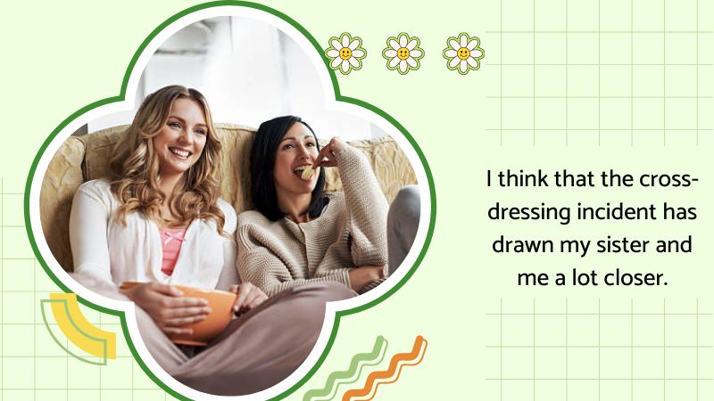 I think that the cross-dressing incident has drawn my sister and me a lot closer. I feel like a sister to her and not like a brother.
