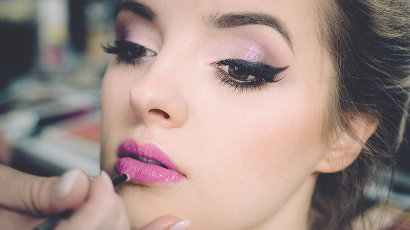 I add highlights to reframe my cheekbones and a dash of dark contour under my chin, along the sides of my face and on either side of my nose. With all of this, I finished with some purple lipstick and the look was ready for the final feminization step.