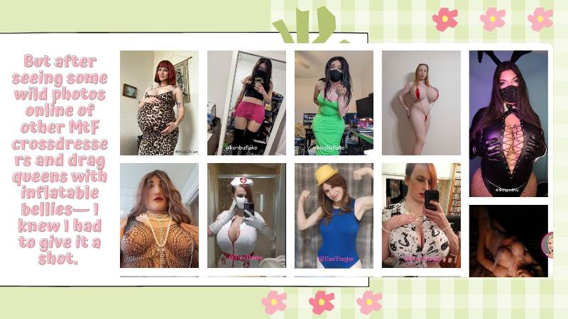 But why did I decide to try this bizarre (and brilliant) idea of crossdressing with an inflatable belly? Honestly, I was curious. I’ve always enjoyed experimenting with different looks. But after seeing some wild photos online of other MtF crossdressers and drag queens with inflatable bellies— I knew I had to give it a shot.