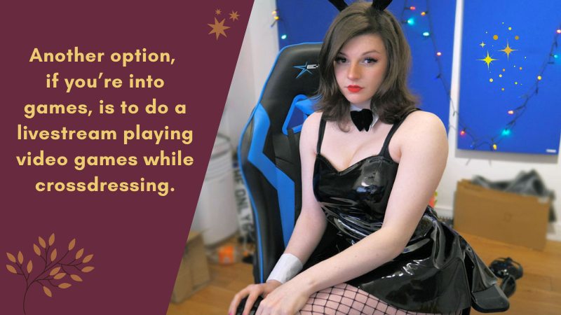 Another option, if you’re into games, is to do a livestream playing video games while crossdressing. I know, it requires a lot of confidence, and i didn’t have enough to try it myself yet. But a few game streamers do that all the time, and give some tips about how they do it. Look it up online, to make sure if it suits you or not. But then again, as it involves exposure on the internet, watch out for trolls and mean comments.