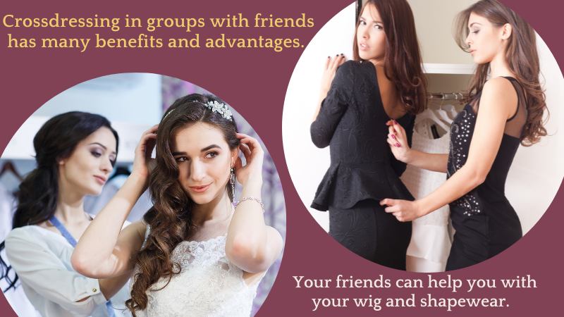 Crossdressing in groups with friends has many benefits and advantages. For example, your friends can help you with your wig and shapewear. They may give you constructive criticism, and give you real-time feedback about your makeup. Or even give you many other tips and teach you techniques they might have learned.