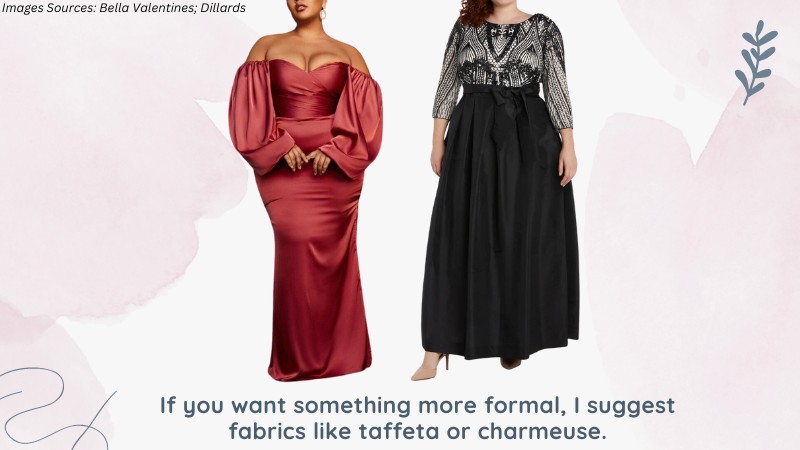 If you want something more formal, I suggest fabrics like taffeta or charmeuse.