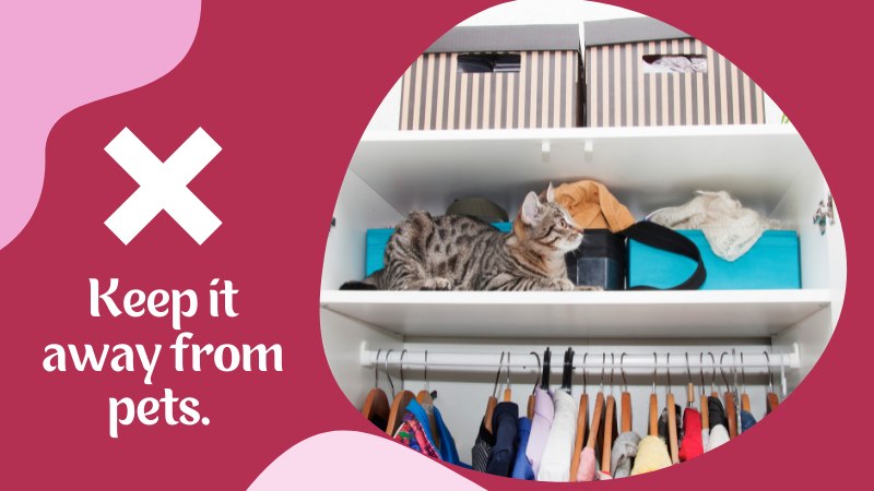 Keep in mind that finding a good place to stash it is also important. The best place is somewhere inconspicuous, such as a shelf or table in your closet. It’s also important to keep it away from flammable materials to not catch on fire and catch your clothing on fire. You’ll also want to keep it away from pets. We don’t need any chewing hazards in the house, especially not a pregnant belly!