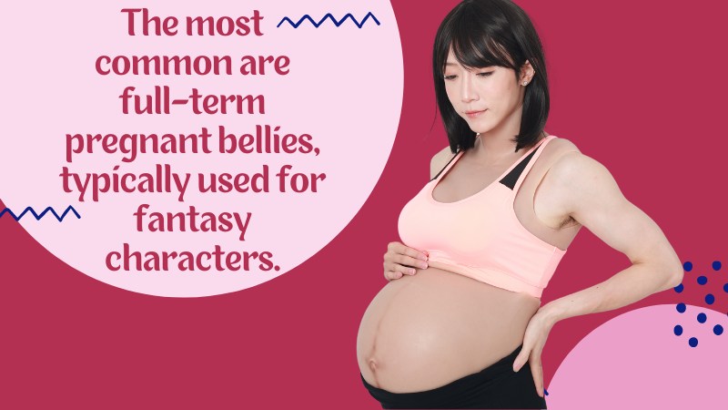 There are many different types of pregnant bellies. The most common are full-term pregnant bellies, typically used for fantasy characters and are either casts from real-life fetuses or made from sensitive materials. These usually take longer to make since they’re intricate and detailed pieces.