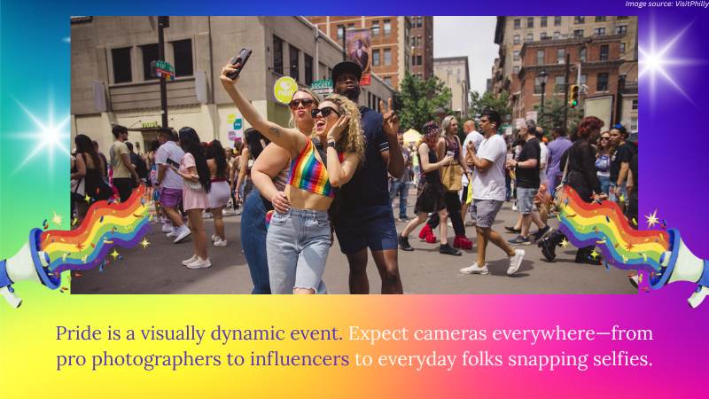 Pride is a visually dynamic event. Expect cameras everywhere—from pro photographers to influencers to everyday folks snapping selfies.