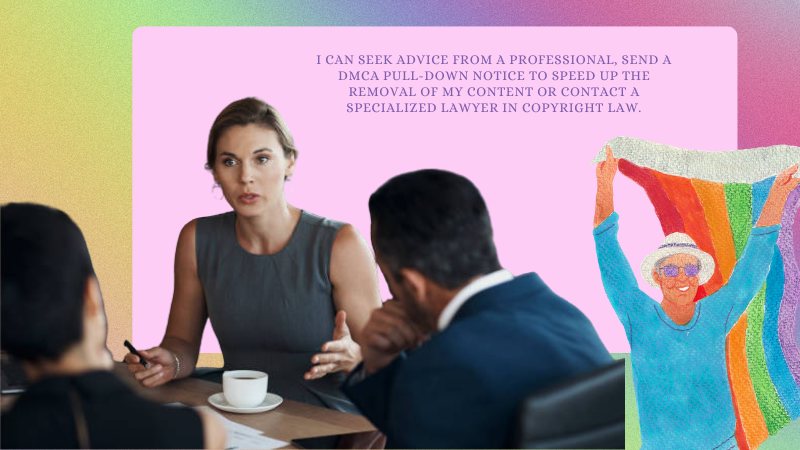 I can seek advice from a professional, send a DMCA pull-down notice to speed up the removal of my content, or contact a specialized lawyer in copyright law.