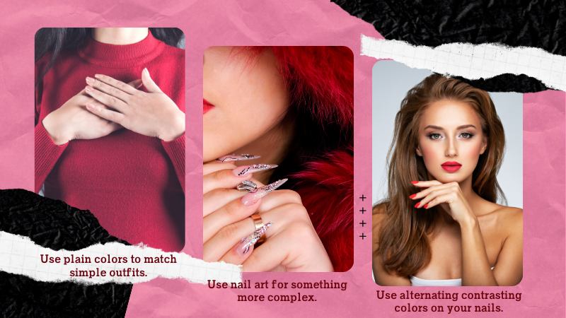 For example, you can use plain colors to match simple outfits and nail art for something more complex.