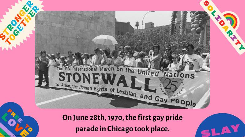 Such rigid laws culminated in resistance to a raid when police became violent. This resistance was spread out across the state of new york, but it originated at the Stonewall Inn, hence the name. People started demanding the right to be themselves. That is, without being arrested for their sexual orientation. The result was that the oppressed now felt empowered, and the oppression began to decline. On June 28th, 1970, the first gay pride parade in Chicago took place, celebrating the first anniversary of the riots.