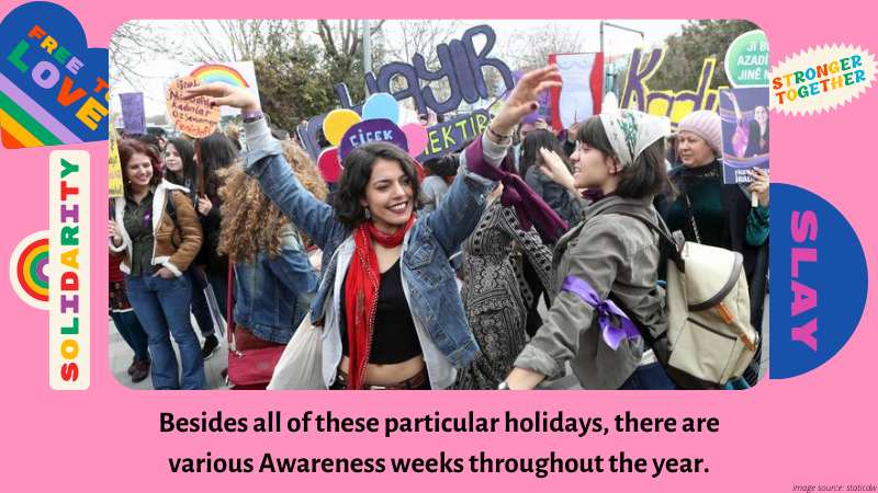 Besides all of these particular holidays, there are various Awareness weeks throughout the year. They promote awareness and integration of various gender identities and sexual orientations. Besides that, such an initiative helps validate different individuals and make them feel part of this community.