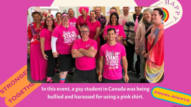 Bullying is a serious problem in both schools and workspaces. Minorities often suffer from it in silence, feeling like they’re alone and have no support to fight back. And in some conservative regions, it affects the LGBTQ+ community more than others. An example of that is something that happened in 2007. In this event, a gay student in Canada was being bullied and harassed for using a pink shirt. Some of his colleagues saw it happen and began a movement where other students showed up in pink the next day.