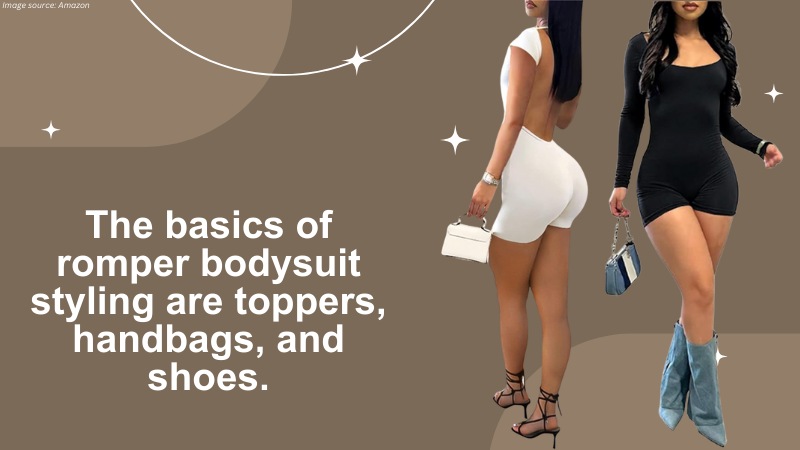 The basics of romper bodysuit styling are toppers, handbags, and shoes.