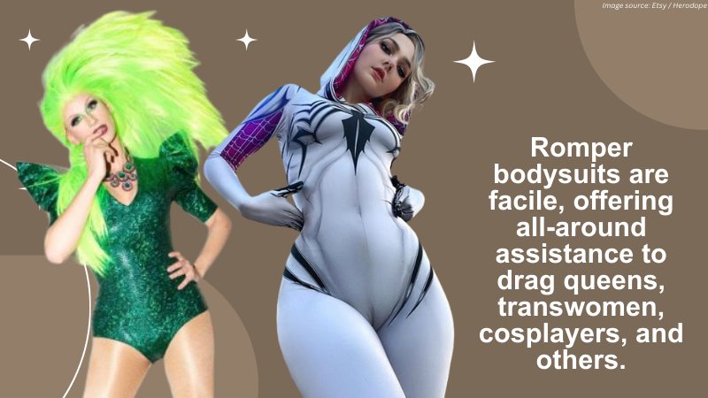 Romper bodysuits are facile, offering all-around assistance to drag queens, transwomen, cosplayers, and others.