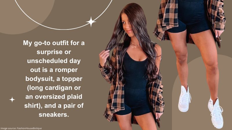 My go-to outfit for a surprise or unscheduled day out is a romper bodysuit, a topper (long cardigan or an oversized plaid shirt), and a pair of sneakers.