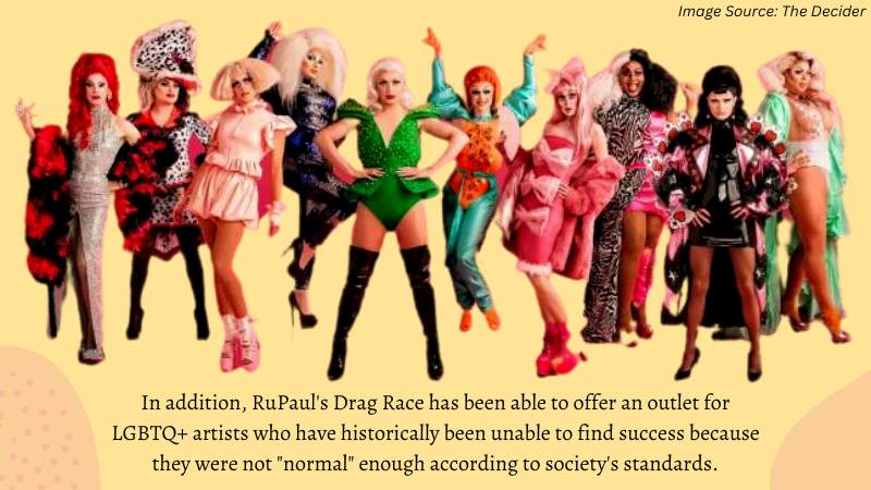 In addition, RuPaul’s Drag Race has been able to offer an outlet for LGBTQ+ artists who have historically been unable to find success because they were not “normal” enough according to society’s standards. For example, if you were too masculine or feminine, if your skin tone was too dark or light, or if your hair wasn’t right—you were ineligible for mainstream success until now.