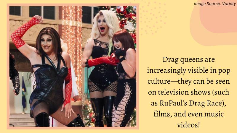Drag queens are increasingly visible in pop culture—they can be seen on television shows (such as RuPaul’s Drag Race), films, and even music videos! They’re often drawn from working-class backgrounds, which makes them an important part of the LGBT community. RuPaul’s Drag Race has had a huge impact on the mainstream popularity and recognition of drag in pop culture.