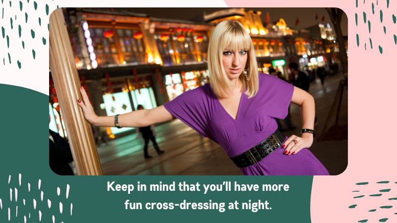 If you seek adventure and excitement, keep in mind that you’ll have more fun cross-dressing at night. Dress up and do your makeup, then head to a pub or bar far from where you live. If possible, drive to a nearby city, minimizing the risks of running into someone you know. You want to be a place where people haven’t met you yet, and will only know your feminine persona. It adds a layer of mystery to your personality, and these random encounters will make things more interesting. This way, you get a fresh start, away from your past and your masculine life.