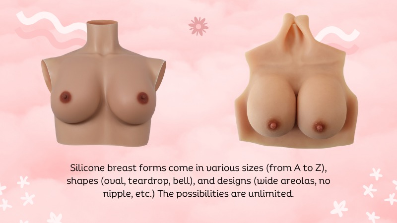 Silicone breast forms come in various sizes (from A to Z), shapes (oval, teardrop, bell), and designs (wide areolas, no nipple, etc.) The possibilities are unlimited.