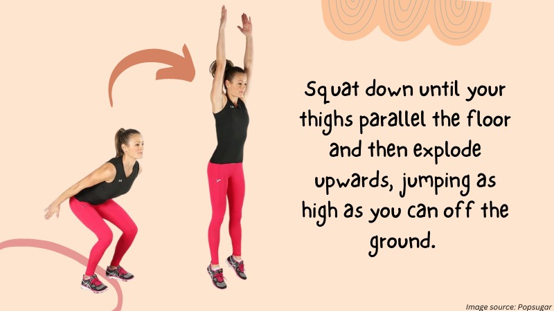 Squat down until your thighs parallel the floor and then explode upwards, jumping as high as you can off the ground. As you lower yourself back down, ensure that your knees are not parallel with your toes and remain slightly bent to protect your joints.