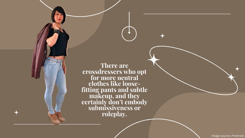 There are crossdressers who opt for more neutral clothes like loose-fitting pants and subtle makeup, and they certainly don’t embody submissiveness or roleplay.