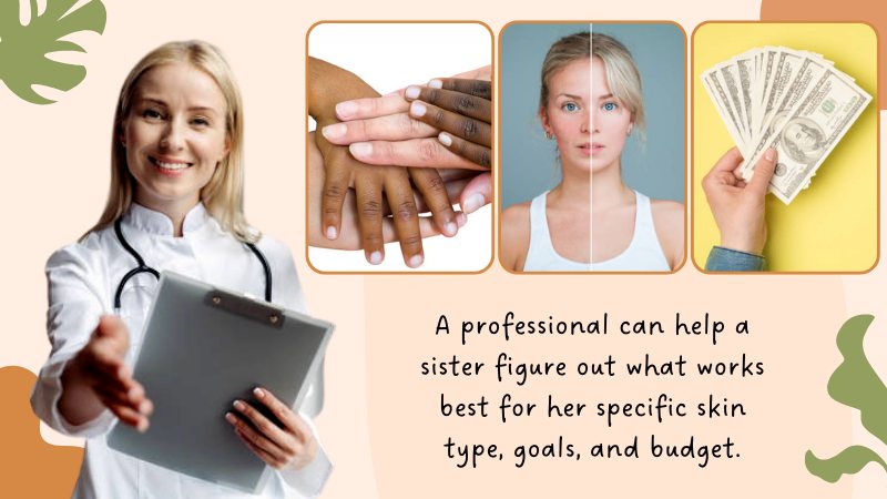 Instead of taking matters into your own hands, consult a dermatologist before you do anything else. There are plenty of different treatment options that will be perfect for whatever issues you’re having or would like to avoid in the future. A professional can help a sister figure out what works best for her specific skin type, goals, and budget. A dermatologist can talk through these options with you and help create an effective treatment plan that meets your needs and goals to achieve that feminine glow.