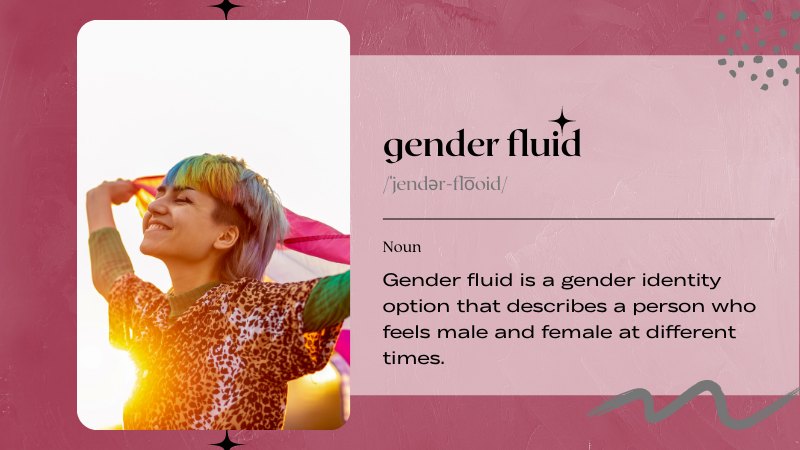 Gender fluid is a gender identity option that describes a person who feels male and female at different times.