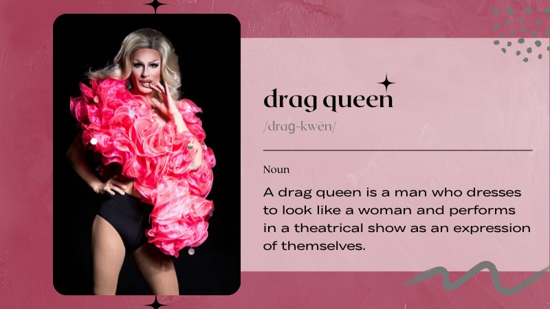 A drag queen is a man who dresses to look like a woman and performs in a theatrical show as an expression of themselves.