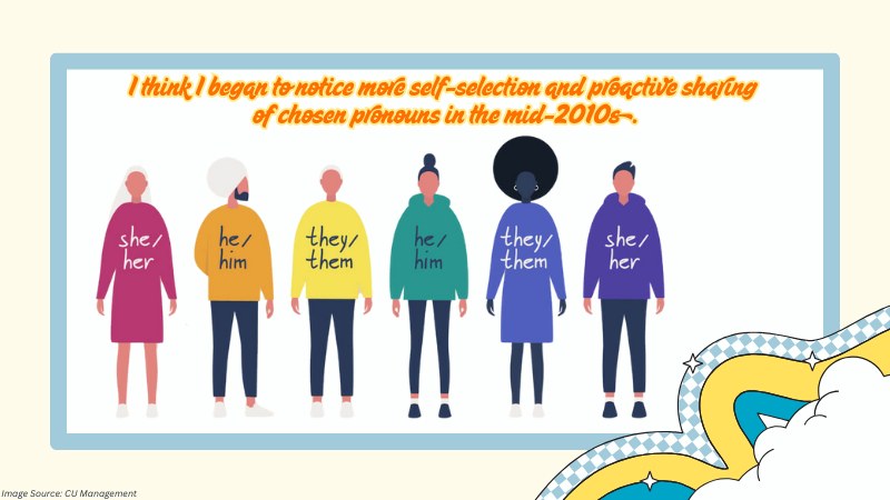Rarely, however, have these labels had to include the basic pronouns that are among the first words any English speaker learns. Furthermore, there are deficiencies that exist in English that make using the traditional vocabulary awkward for modern use. I think I began to notice more self-selection and proactive sharing of chosen pronouns in the mid-2010s.