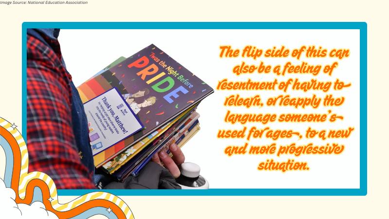 The flip side of this can also be a feeling of resentment of having to relearn, or reapply the language someone’s used for ages, to a new and more progressive situation. Furthermore, there are only a certain number of 3rd person pronouns in English, and huge gaps exist in identity between the very prescribed meanings of English pronouns. For example, nearly all English speakers learn the word they as a word for a group; having to use it instinctively to describe an individual is a big adaptation.