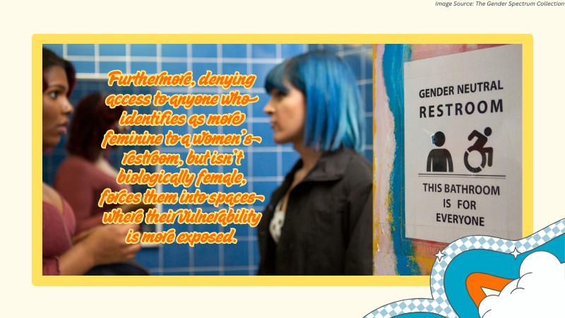Furthermore, denying access to anyone who identifies as more feminine to a women’s restroom, but isn’t biologically female, forces them into spaces where their vulnerability is more exposed. It gives permission to enforce a certain cookie-cutter, prescriptivist version of masculinity and femininity, and a return to a more active policing of gender expression through bullying and ridicule.