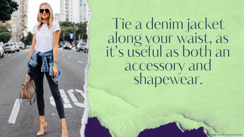 A common ipi is to tie a denim jacket along your waist, as it’s useful as both an accessory and shapewear.