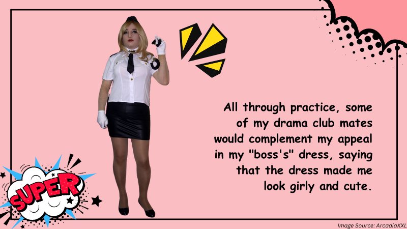 All through practice, some of my drama club mates would complement my appeal in my “boss’s” dress, saying that the dress made me look girly and cute.