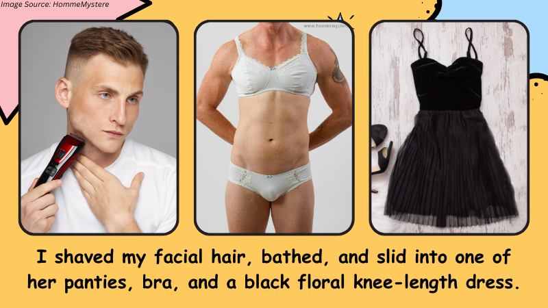 That is, I shaved my facial hair, bathed, and slid into one of her panties, bra, and a black floral knee-length dress.