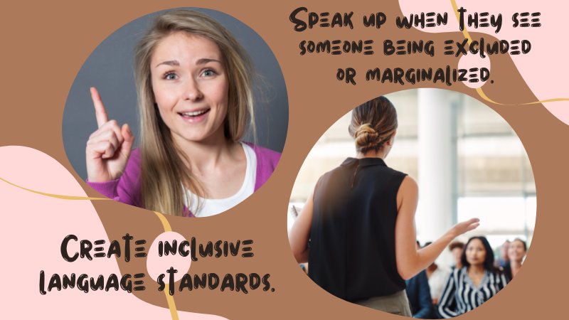 - Encouraging allies to speak up when they see someone being excluded or marginalized because of their gender identity.