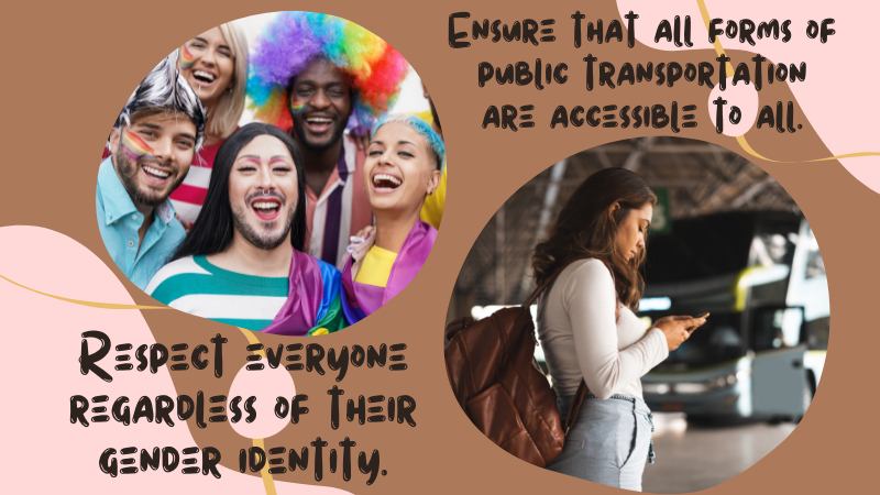 - Ensuring that all forms of public transportation, as well as government services and facilities, are accessible to all, whether they’re male, female, or non-binary. Gender identity shouldn’t be used as a requirement to access these basic amenities.