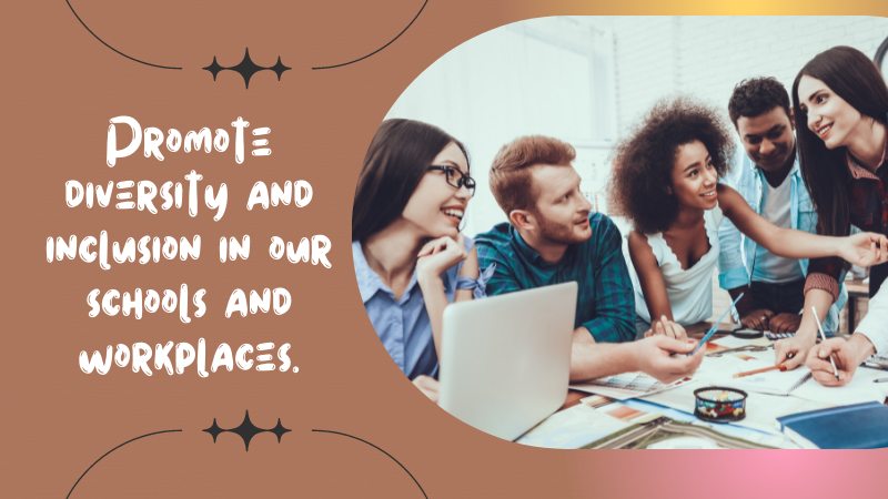 - Promoting diversity and inclusion in our schools and workplaces so that everyone feels welcome and supported.