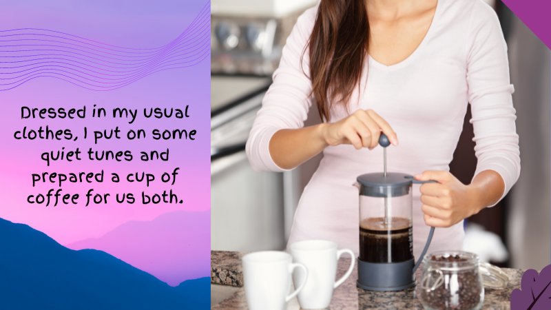 Dressed in my usual clothes, as I didn’t want to shock her, I put on some quiet tunes and prepared a cup of coffee for us both.