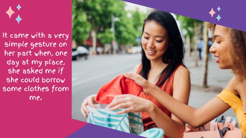 It came with a very simple gesture on her part when, one day, at my place, she asked me if she could borrow some clothes from me.