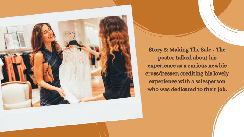 The poster talked about his experience as a curious newbie crossdresser, crediting his lovely experience with a salesperson who was dedicated to their job. Liz, the saleslady who helped the poster, became his friend fast.