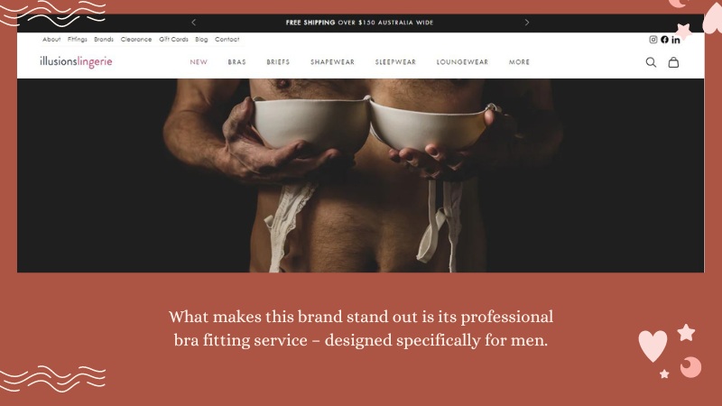 What makes this brand stand out is its professional bra fitting service – designed specifically for men. The experienced bra fitters at Illusions Lingerie welcome “every” body.