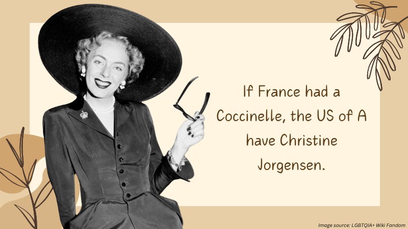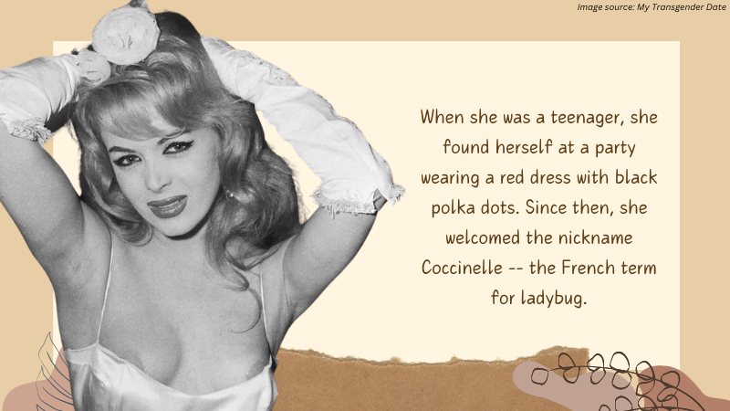 Our Queen Ladybug, Mademoiselle Coccinelle was a 1953 transgender showgirl. One of the bravest out there, with letting the public in on her gender assignment surgery (GRS) — and in the post-time war too, where transgender individuals were not exactly embraced by society. She was a regular performer in Le Carrousel de Paris, a famous 1950s cabaret, along with equally talented transwomen like Bambi and April Ashey.